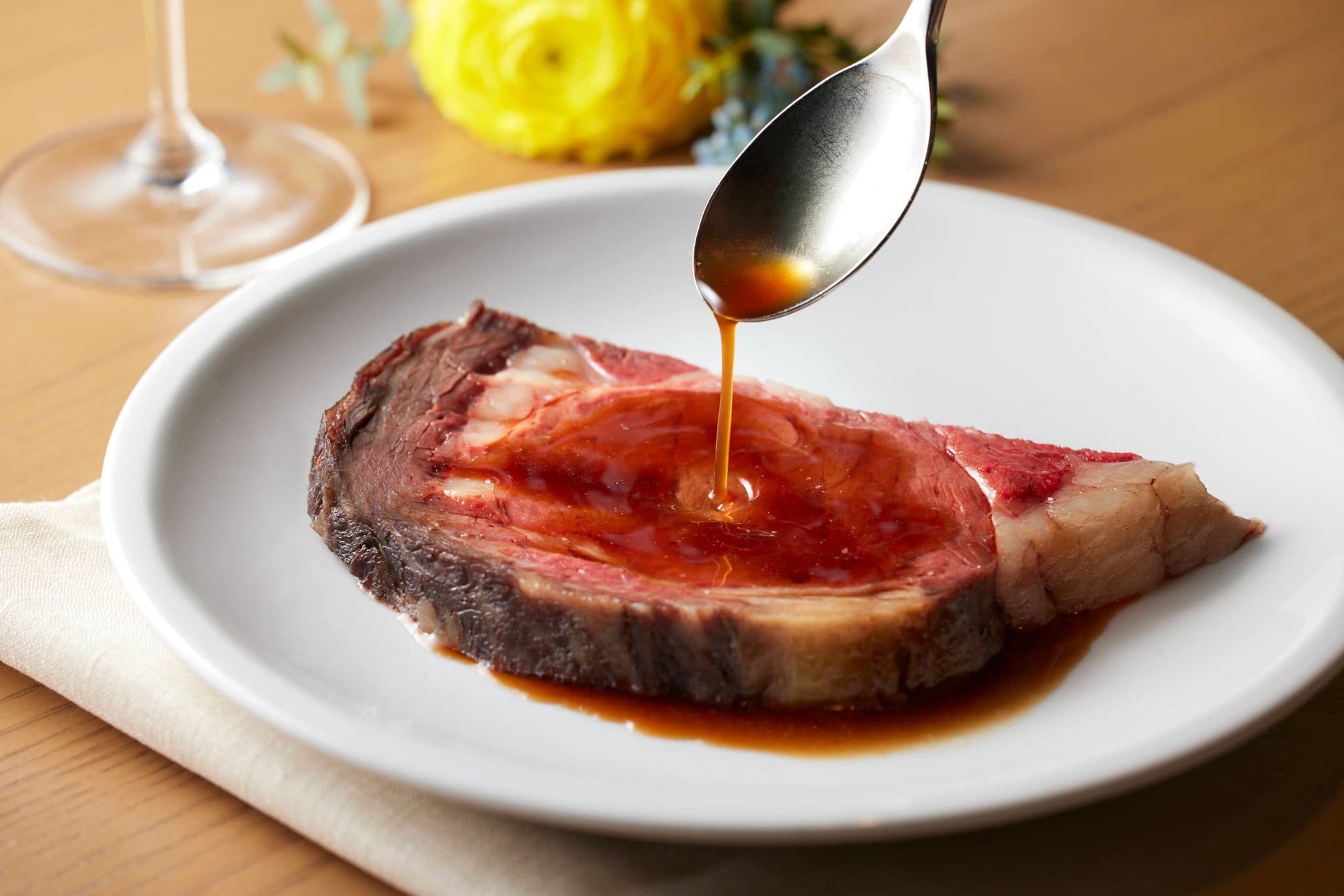 プライムリブは低温でローストして旨みを凝縮させた逸品です。 するっとナイフが入るほどの驚きの柔らかさと、肉本来が持つしっかりとした繊維質やジューシーさを楽しめます。添えられた深い味わいのオ・ジュソースがお肉の味を引き立てます。 お好みでホースラディッシュを付けてお楽しみください。