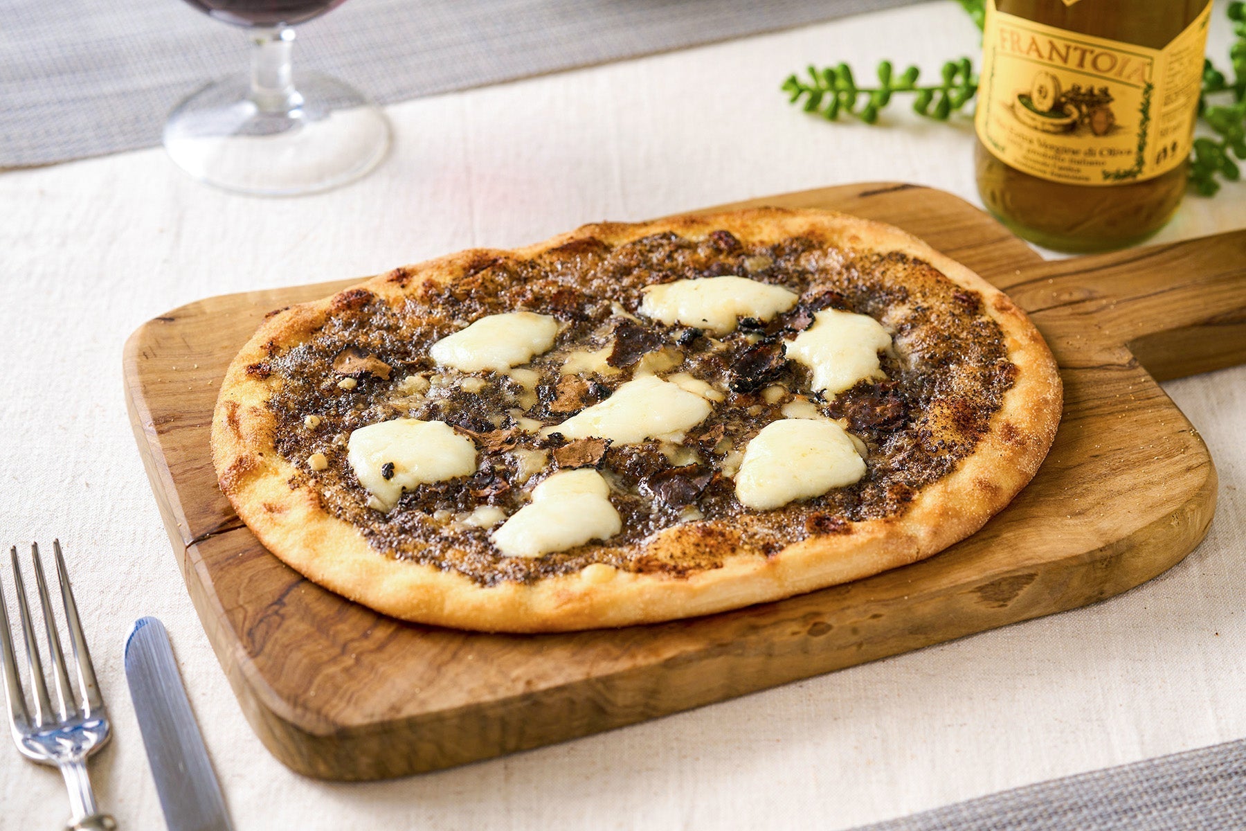 ピッツァ タルトゥーフォ(トリュフピッツァ)は、濃厚なマッシュルームペーストに 水牛モッツァレラチーズを乗せて焼き上げ、香り高いウンブリア産トリュフをトッピングした贅沢なピッツァです。