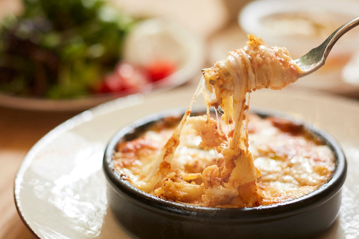 トラディショナルラザニアは、熱々の水牛モッツァレラチーズを堪能できるオリジナルミートソースを使用しています。
