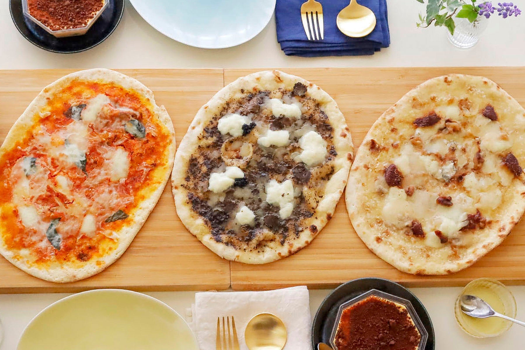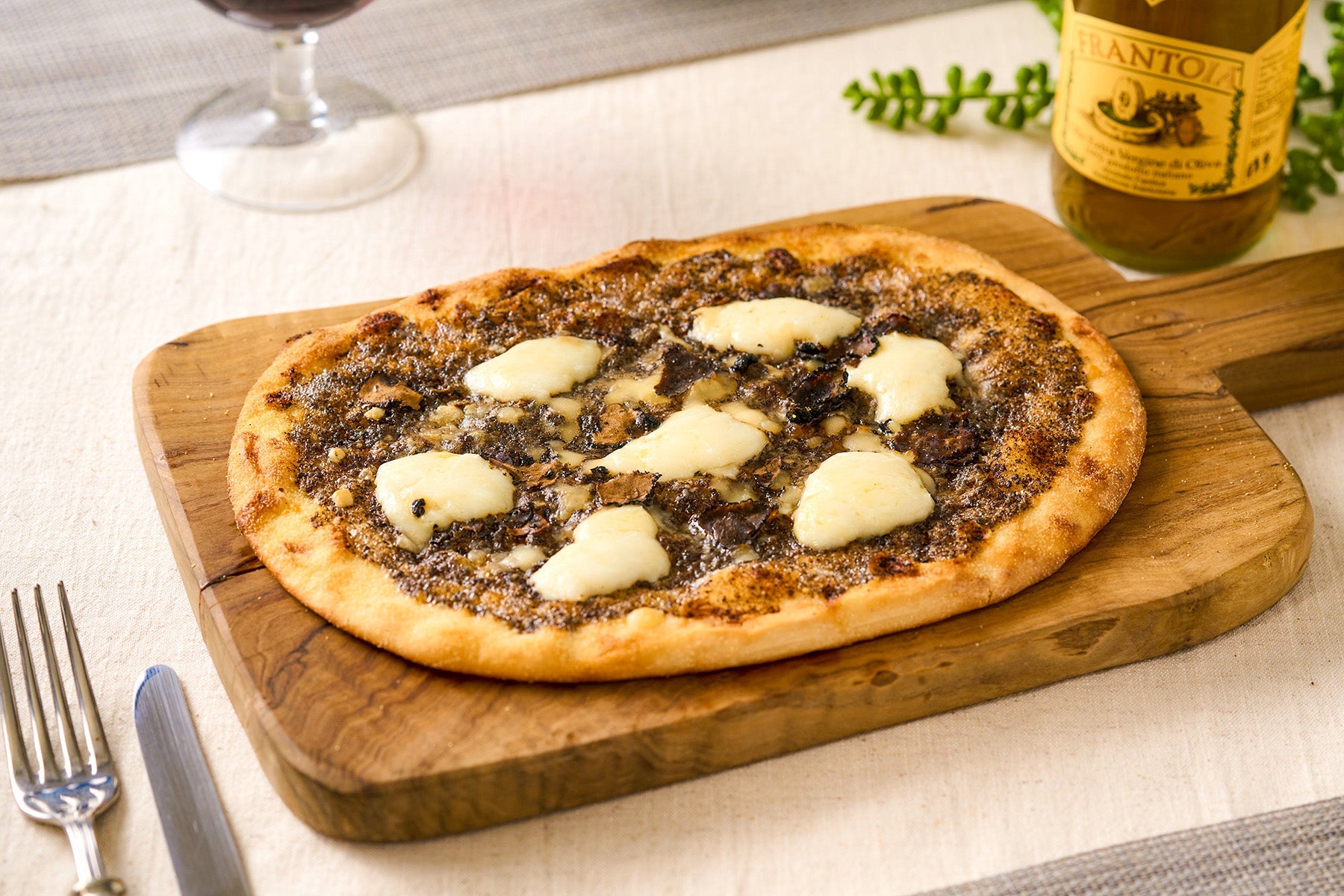 水牛モッツァレラチーズのオリジナルピッツァ3種類を楽しめます。タルトゥーフォは、濃厚なマッシュルームペーストと香り高いウンブリア産トリュフが特徴のオンラインショップ人気No.1商品。ブッファラDOPは、イタリア産モッツァレラチーズとさわやかな酸味のあるセミドライトマトソースのピッツァ。チンクエフォルマッジは、贅沢にイタリア産5種チーズを使用した濃厚な味わいが特徴。